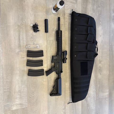 Jeg sælger min riffel da jeg ikke får den brugt. den er brugt få gange. Det kan skyde op til 3 joule der medfølger to magasiner og en slynge som sidder på
