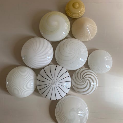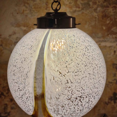 Den smukkeste italienske vintage murano lampe, med krom og tre kupler i det smukkeste glas, gennemsigtigt yderst og mælkehvide inderst. Den har lidt aldersbetinget patina på metallet, men glassene er intakte. Den er fra 1960’erne, købt på auktion i Italien. Den er i space age stil.