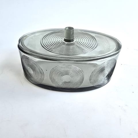 2 røgfarvede lågskåle fra Holmegaard - “Skjold” af Per Lütken. Måler 15 x 9 cm og er 8,5 cm høje - begge i fin stand ! Pris pr stk 160 kr.