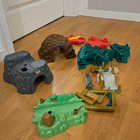 9 meters flexi-trex bane med 1 bil der virker og (3 controllere- ved ikke om de virker) + Mange andre elementer man kan bruge til kreativitet og sjov leg, såsom tuneller, broer osv.