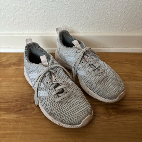 Hvide Adidas-sneakers i tekstil. Skoene er str. 41 1/3, men lidt små i størrelsen. De er brugt en del, men fremstår i fin stand. De trænger til at blive vasket.