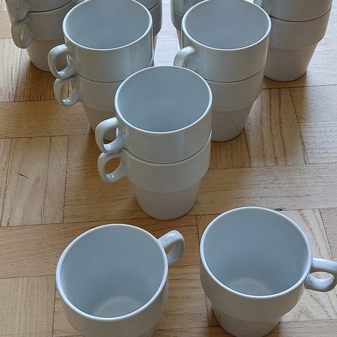 Nye og ubrugte. Stabelbar Brønnum krus. 80x90 mm 28 cl, Hvid Porcelæn. Kasser med 6 stk. Har 8 kasser. Sender gerne på købers regning. Pris pr kasser med 6 stk