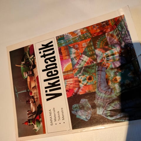 Viklebatik - teknik, mønstre, materiale, MED farveskema, så du kan blande farver, Sara nea, emne: håndarbejde, Let og sjov måde at få nyt tøj på - osse på brugt tøj. Ved at vikle, isolere og farve tøjet, får du flot mønstret tøj. I bogen findes udførlige beskrivelser og farvefotos på 65 variationer. Du kan osse skabedine helt egne mønstre.