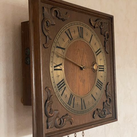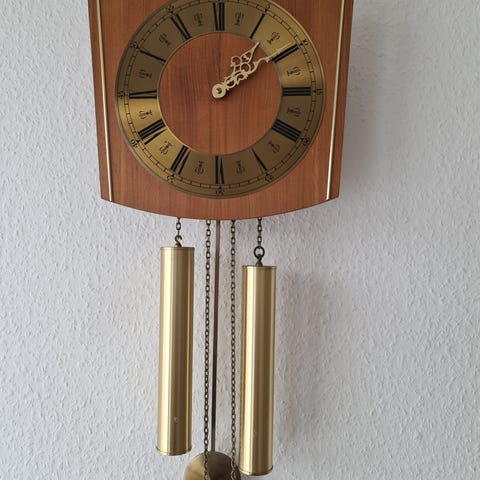 Har dette vægur med lodder, desværre har den fået fugt og givet skjold på træskiven, og loddene er anløben