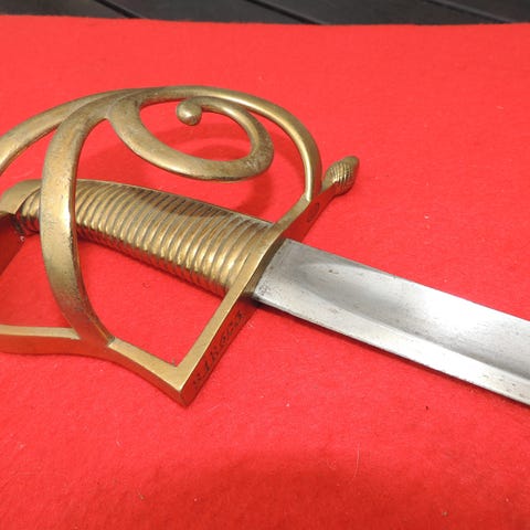 Denne sabel er fremstillet i Tyskland - godkendt til den danske hær med stempel: 91 under kongekrone (1891) - og så hærens kassationsstempel : Et kraftigt kors.