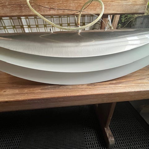Elegant loftslampe udført i cement og med gylden belægning inden i og på kanten rundt. Gyldent lysskær. Ca højde på keglen 34cm.