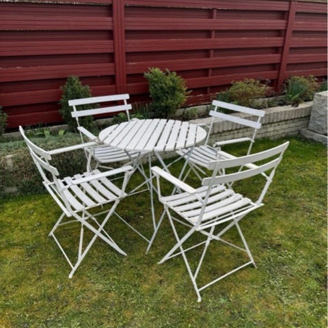 Smukt cafésæt i klassisk fransk stil, bestående af et rundt bord og to tilhørende stole. Sættet er lavet med dekorative detaljer og har en patineret hvid finish, der skaber en charmerende og hyggelig stemning – perfekt til haven, terrassen eller altanen.