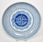 kinesisk Wanshou tallerken, Dekoration i underglasur blå, diam. 26,5 cm, udbedring