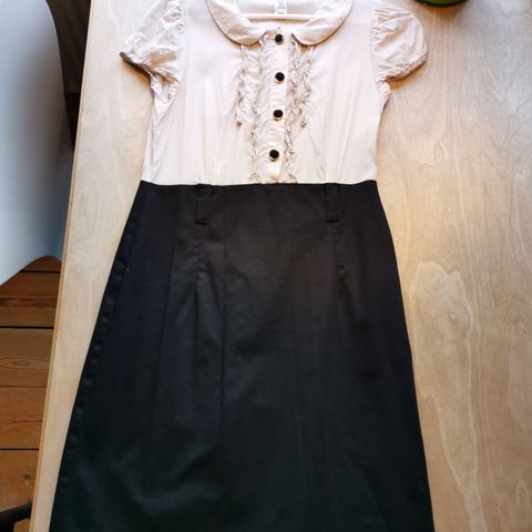 Lyserød kjole med hvide mønster detaljer, den er lidt plisseret i skørtet
