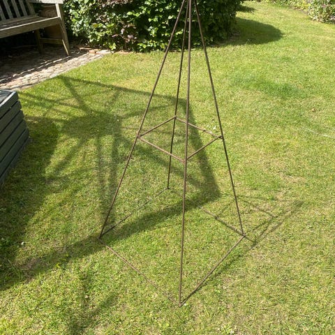 Sælger et sort jernstativ til klatreplanter – perfekt til fx klatreroser, klematis, kaprifolie eller andre slyngplanter. Både dekorativt og praktisk i have.