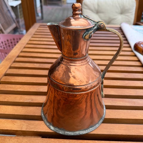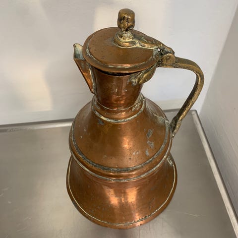 Spændende antik kande med låg. Fortinnet indvendigt. Måler 36 i højden og 16 cm i diameter.