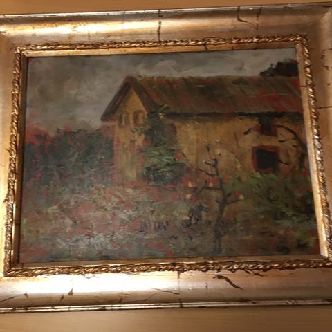 Oliemaleri, Karen Jensen, b: 70 h: 50, Karen Jensen, malerinde Holbæk, ahlgade, motiv badmintonhal som lå bag hotel Isefjord- har ikke Jem & fix men kan godt sende