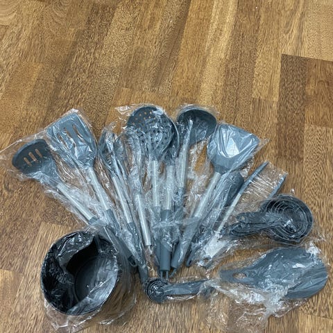Dette sæt indeholder skærebræt, en kniv, dåse åbner og to servietter.