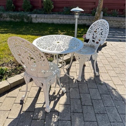Et unikt sæt, der skaber en hyggelig og romantisk stemning i enhver have. Der er brugsspor, men sættet står stadig flot og solidt.