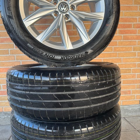 Originale WV 18 “ alu-fælg til Tiguan model 2018. Dæk fra Hankook model ventus S1 evo ^2 SUV. 4 komplette hjul. Produktionsdato uge 18 år 2019. 235/55R18 100v. Ca. 0,6/7 mm slidbane. En enkelte ridse på den ene fælg.