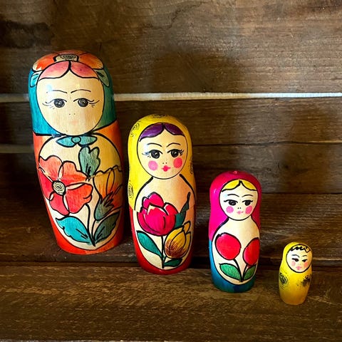 Andre samleobjekter, Retro Babushka, Retro Babushka - længde på den største ca. 9 cm., den næststørste Babushka har en revne i overdelen - se fotos. - ellers i pæn stand.