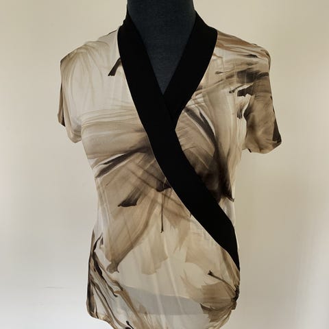 Bluse fra Max Mara i 92% viskose og 8% elastan, Størrelsen er angivet til XL, men husk det er italiensk størrelse, så deres XL er mindre end dansk XL. Brystmål er cirka 96 cm..