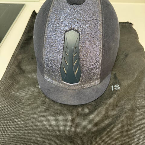 Ridehjelm størrelse 59-60. Lille rift i overforingen. Kan hentes i København eller Nordsjælland eller sendes på købers regning.