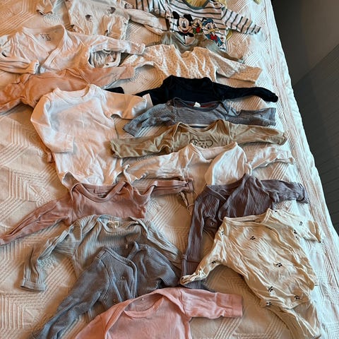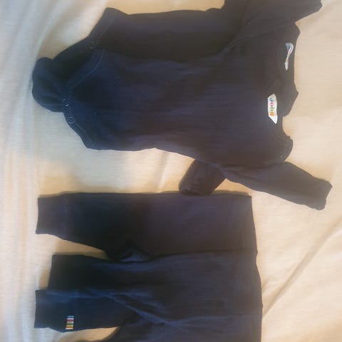 Joha tøjpkke bestående af langærmet body, kyse og heldragt i uld/silkeblanding, body uden ærmer og bukser i uld, samt joggers i bomuld. Tøjet er brugt men i virkelig god stand. Der er ingen pletter eller huller i tøjet. Tøjet kommer fra røgfrit og kæledyrsfrit hjem.