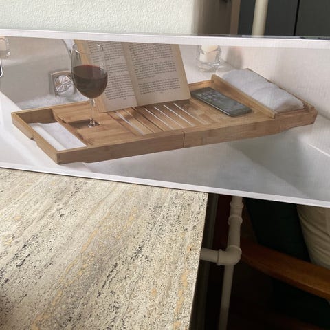 Sæde/hylde til badekar. Justerbar. Aldrig brugt. Sæde mål: 20 x 40 cm.