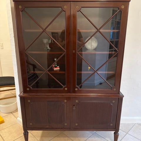 "Butiks" vitrine i mahogni m/ originalt glas. (aflåselig).