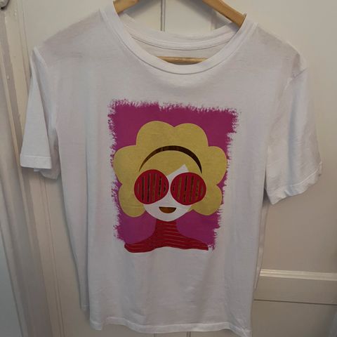 Hvid T-shirt med et tryk af en mor og et barn i en tegneseriestil. Motivet er i lilla og blå nuancer.