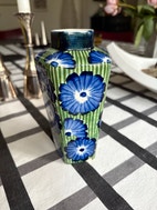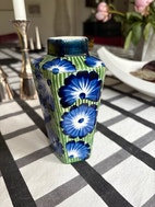 Fajance-vasen er i særdeles god stand, bortset fra et lille nag nederst: se nærbillede. Ingen hårrevner! Ej heller krakeleringer i dekoreringen!
