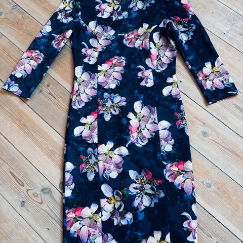 Kjolen er grå med et blomstret mønster, designet til daglig brug.