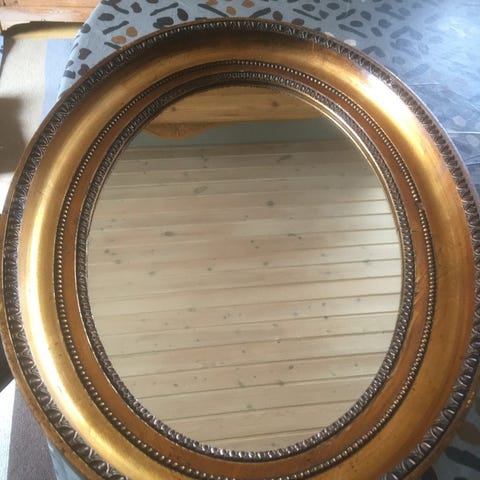 Spejl, Vintage, En af de gamle skønne spejle - her med rød ramme. Ren retro. 40 cm i diameter. Der mangler en ophængsløsning.
