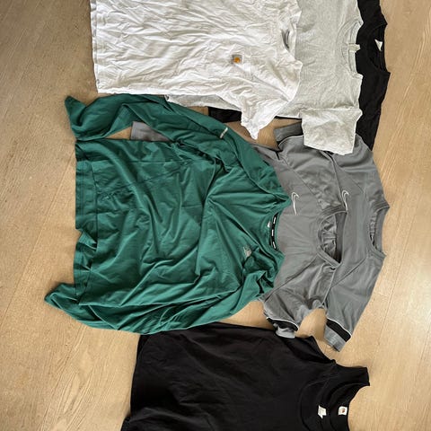 Lækker tøjpakke med fem t-shirts og en sweater. Der er tre t-shirts fra Superdry (str. S og XS) og to fra Streetammo (M) samt en sweater fra Anerkjendt (L), men som du kan se, er de samme størrelse. Sweateren er en slimudgave.