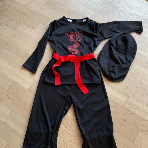 Udklædningstøj, Fastalavns udklædning, Ninja udklædning set med bukser (lille hul i knæet), trøje og rød og sort bandana. Str 128.