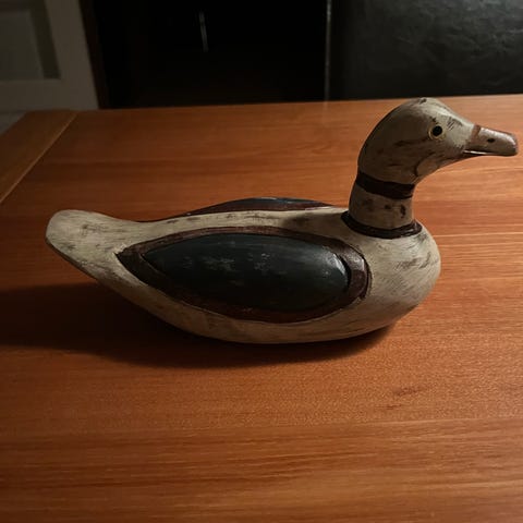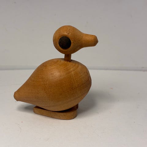 And, Træand udført af røget egetræ med næb og hale af bøgetræ rigtig flot håndarbejde. Hovedet kan drejes i alle retninger. 150. kr. pr. stk.
