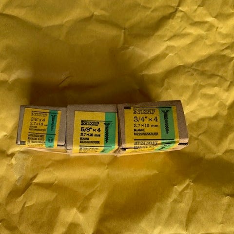 Uåbnede æsker med NKT forniklede messing skruer, linsehoved og lige kærv. Ø4.8mm x 19 mm , kraftige og korte