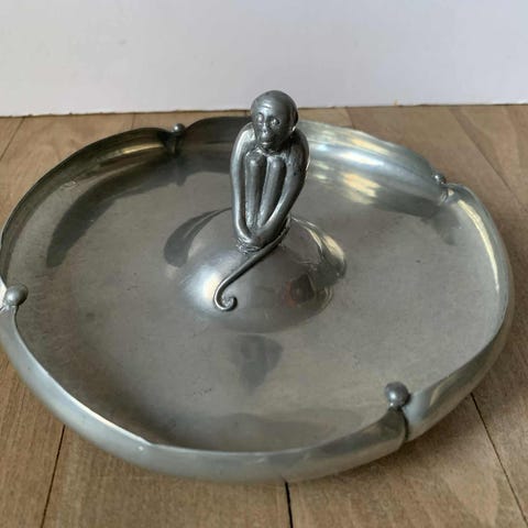 Tin, Skål / bakke, Stork, Gammel tinskål med indlagt broderi under glas. Oprindeligt askebæger men passer fint til at lægge småting på, som flaskebakke eller bare som fin derkoration Diameter 15 cm , højde 3 cm.
