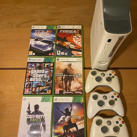 xbox 360 s med rigtigt mange spil generelt i god stand enkelte har lidt småridser men alt spilbart, 25 gB harddisk (mangler kabel) og 2 controllere (mangler kabler)