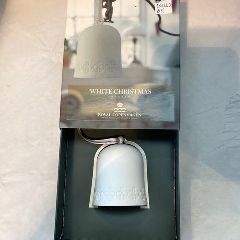 White Christmas Royal Copenhagen klokke, Fin klokke stadig i original æske. Ca. 7,5 cm høj og en diameter forneden på 5,5 cm.