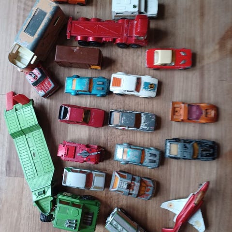 6 retro legetøjsbiler. De 4 første er Matchbox til 30 kr pr stk. Så kommer der en stor Corgi til 75 kr samt en James Bond-bil til 50 kr.