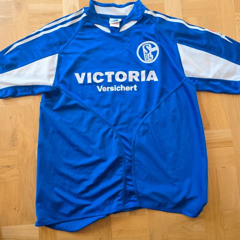 Schalke 04-trøje fra 2005. Størrelsen er en "youth XL" hvilket målmæssigt svarer til SMALL. Den måler 69x50.