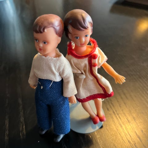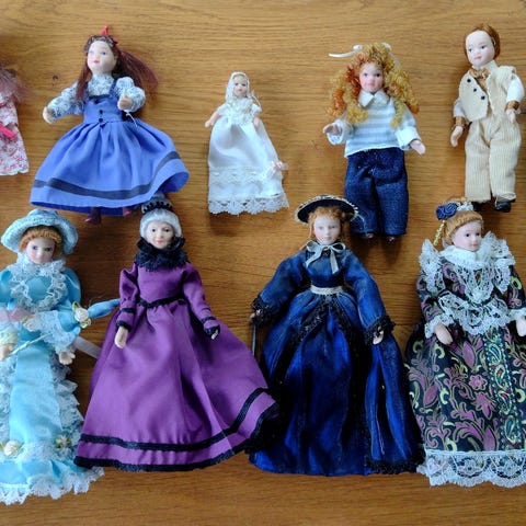 Meget smukke dukkehusdukker i de yndige kjoler og hatte. Voksne 125kr stk, drengen 75kr