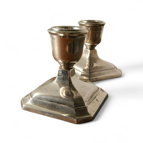 6 styk sølv plet lysestager fra Prima. Stemplet PRIMA H. Gr. MADE IN DENMARK. (H. Gr. = Hugo Grün.) Til kertelys eller julelys.
