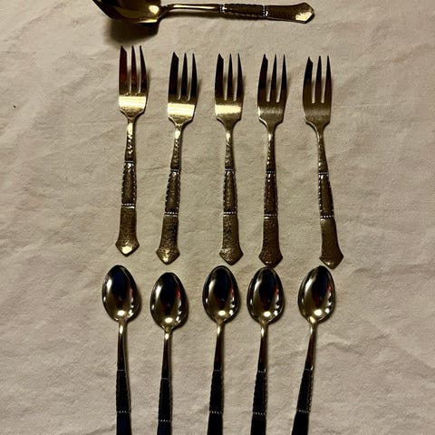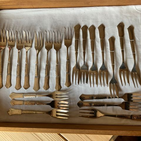 Bestik Louise 6 styk kagegafler og 1 marmeladeske i sølv plet.
