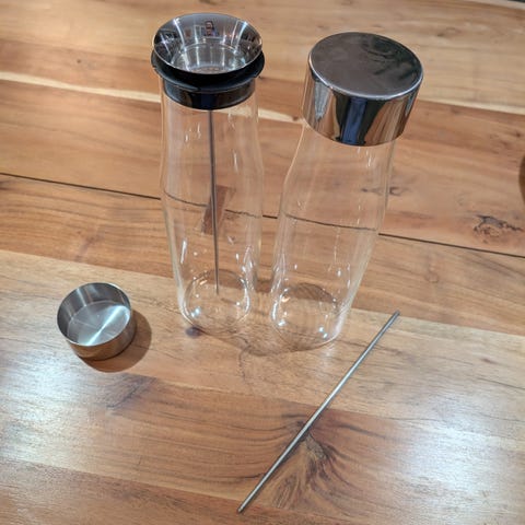 Drypfri Eva Solo vandkaraffel 1 liter. Jeg har ikke et låg til den, men det kan købes hos isenkræmmeren, hvis man har brug for det.