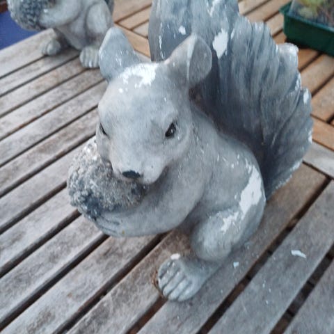En fin havefigur der forestiller et egern med et agern mellem forpoterne.