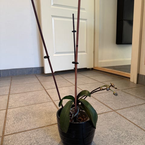 gul orkide i brunlig smuk gammel krukke med 3 ben. orkideen blomstre smukt i marts -påsken gule blomster, lige pt fyldt med knopper og nye grene