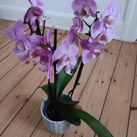 smuk gul orkide i gammel 3 benet keramik krukke Blomstre i påsken -marts-april md .lige nu fyldt med masser af knopper og nye grene