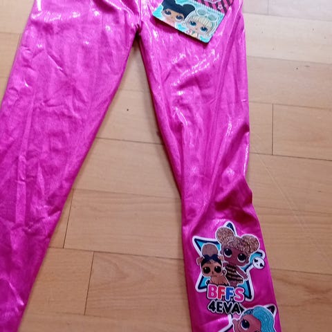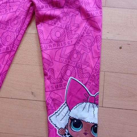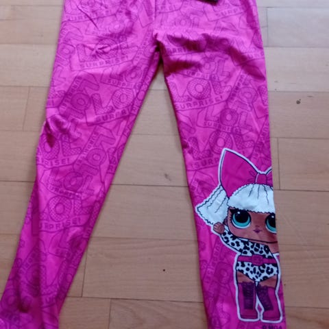 Pink leggings med LOL Surprise! tryk. Bukserne har et gentagende mønster af LOL Surprise! logoer og en stor LOL Surprise! dukke på det ene ben.