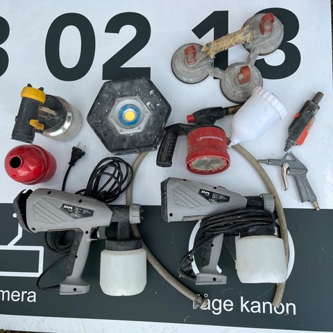 2 malersprøjte, en rensepistol, en sandblaster, en luft blaster, en pumpepistol med dæktryksmåler, 10 meter slange.