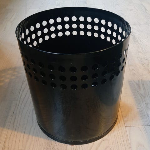 Den vildeste affaldsspand i jern som er godt patineret. Den er helt speciel, idet den er lavet af jernplader hvor der er udstanset materiale til patroner (til 2. verdenskrig). Så affaldsspanden er således et restprodukt fra patron-produktion.