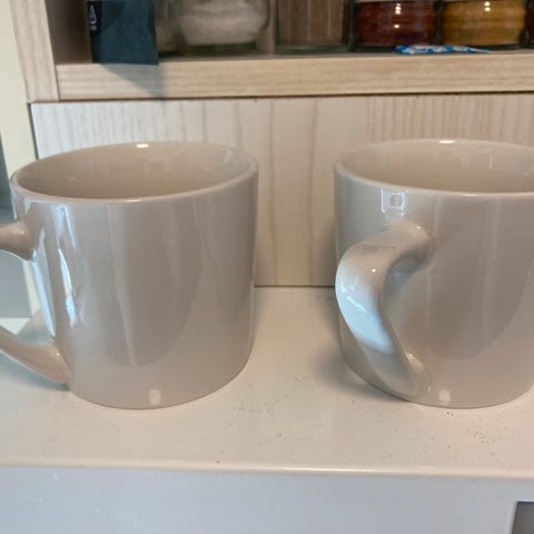 Store, flotte, nye te krus i porcelæn. 9,5 cm høje. 7,7 cm i diameter. Hvide med røde hjerter. Aldrig brugt. Bare stået til pynt. Ukendt mærke.