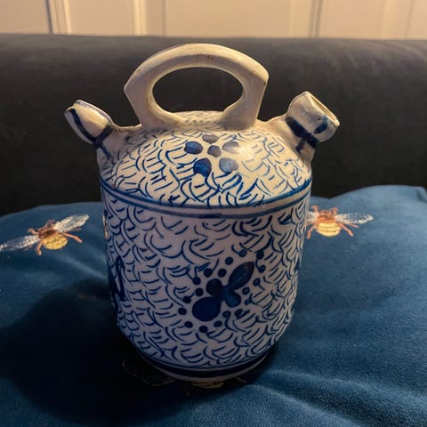 Smuk og unik håndlavet keramik-kande, også kendt som en botijo – en traditionel spansk vandkrukke, designet til at holde vand koldt på naturlig vis.